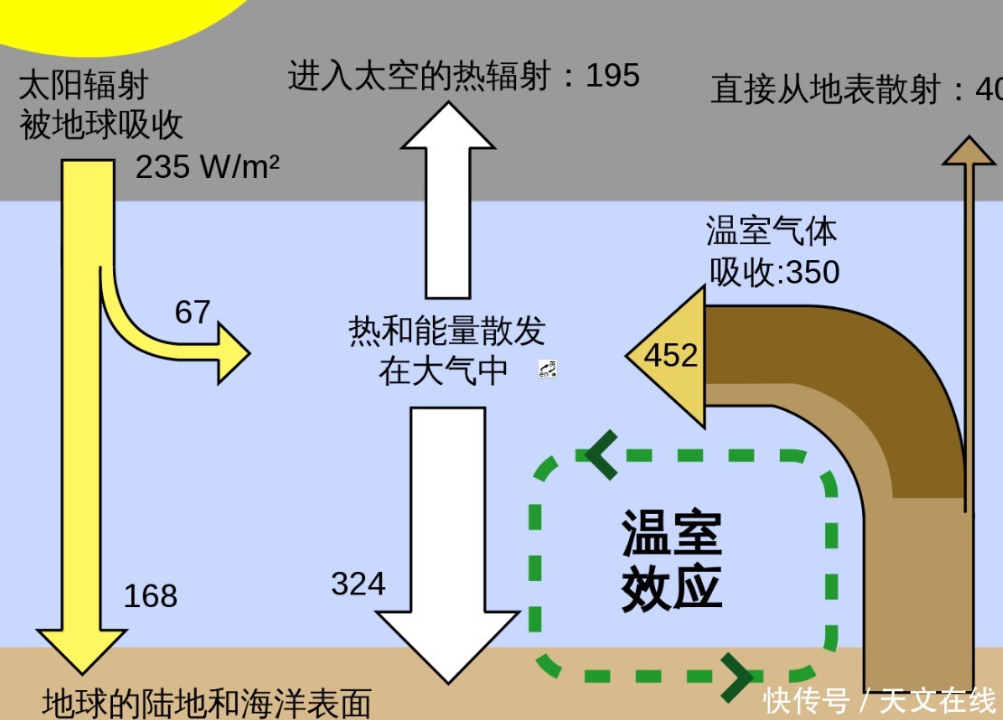 太阳辐射主要是因为短波辐射,然而地面辐射和大气辐射则是长波辐射。大气对长波辐射的吸收力较强,对短波辐射的吸收力较弱。白天时,太阳光照射到地球上,部分能量被大气吸收,部分被反射回宇宙,大约47%的能量被地球表面吸收。晚上地球表面以红外线的方式向宇宙散发白天吸收的热量,其中也有部分被大气吸收。